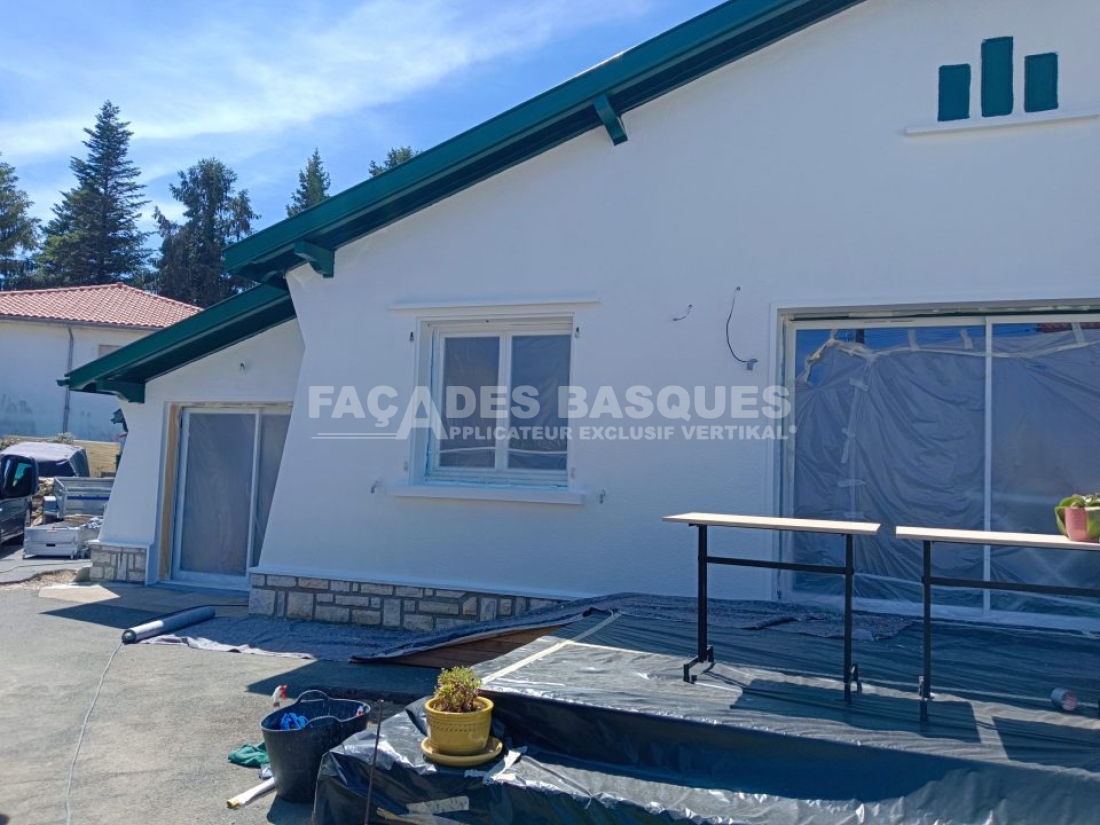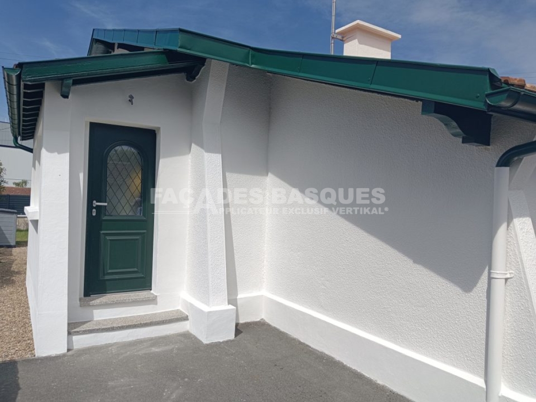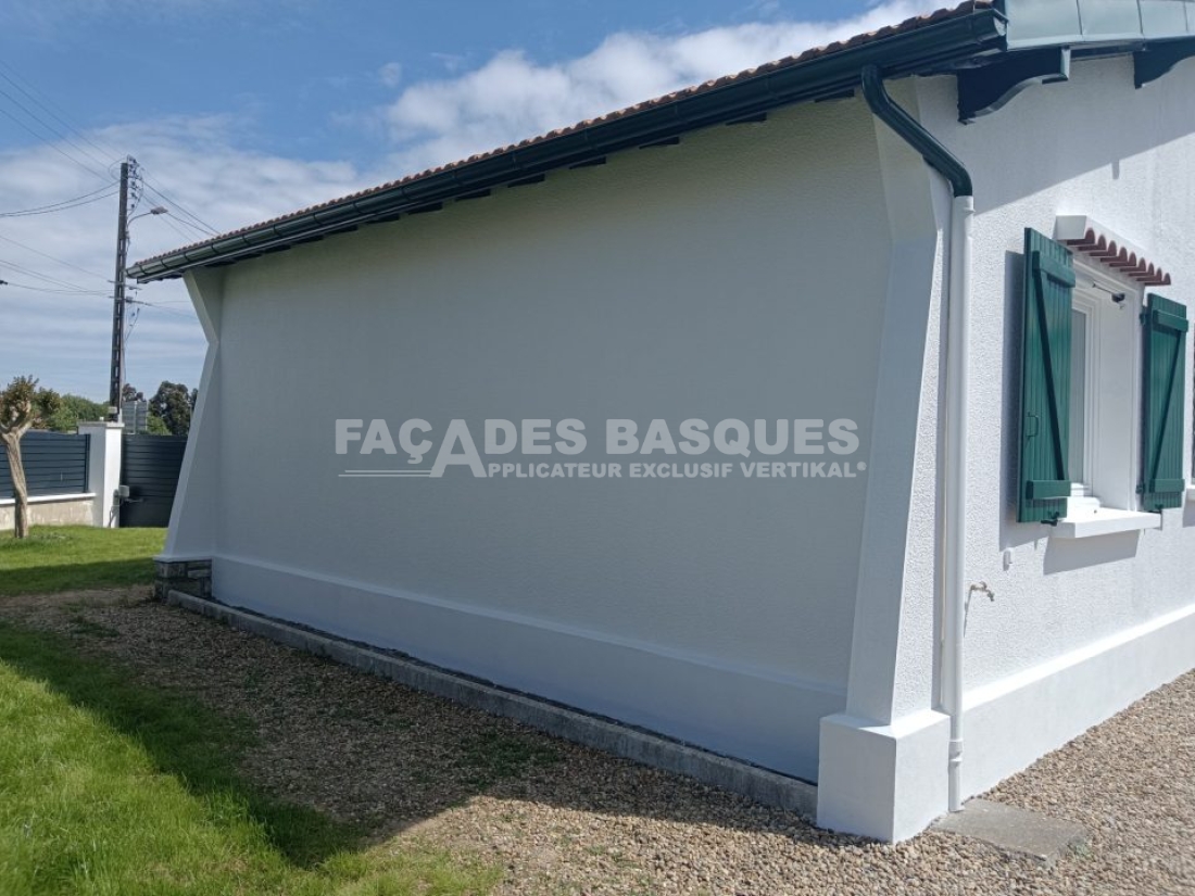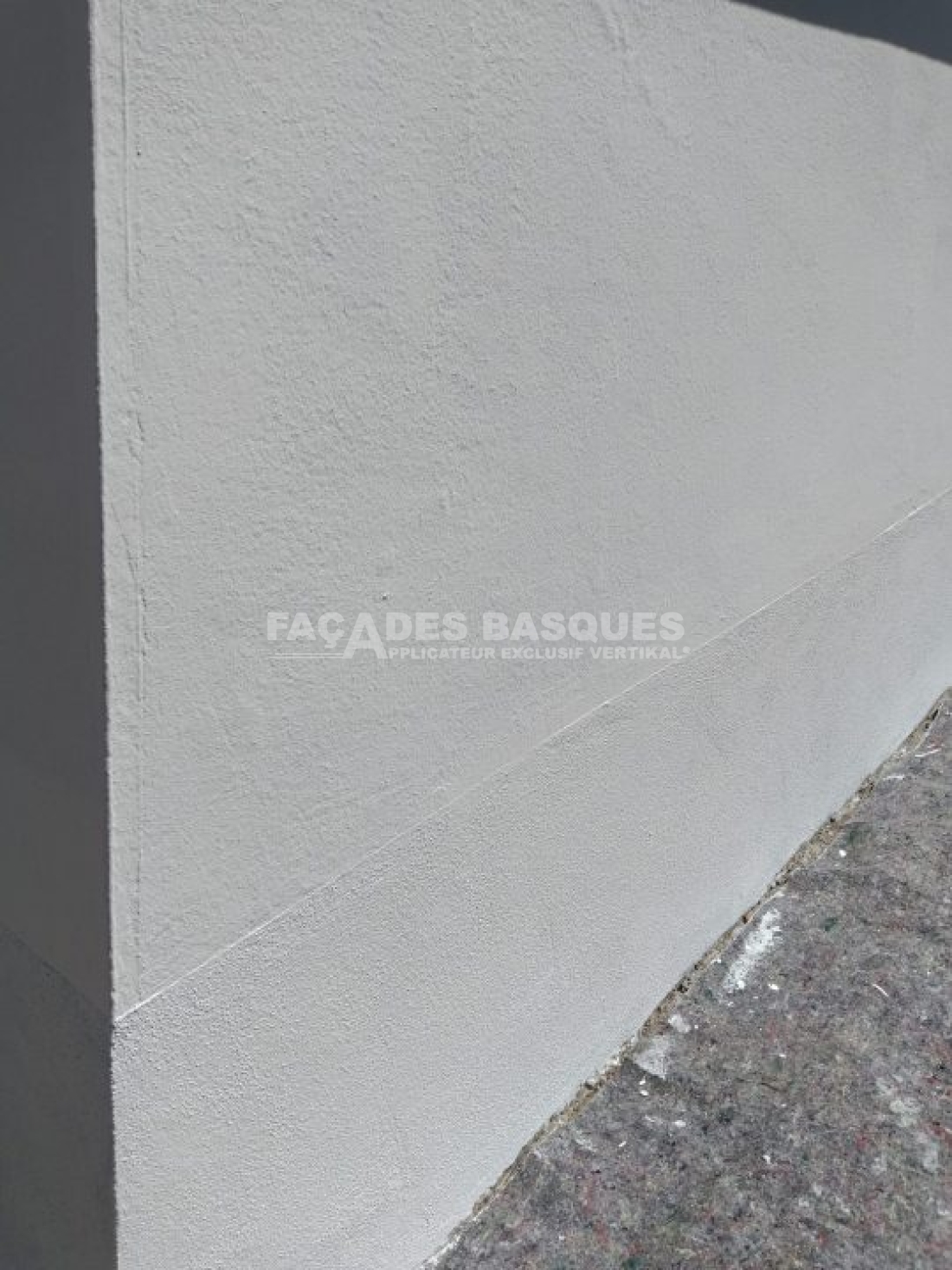 Arrive alors la phase des finitions : en premier lieu, nous avons appliqué le fixateur VERTIKAL CT, teinté blanc. Très garnissant, il assure une parfaite accroche pour notre revêtement de finition qui, pour cette maison d’Anglet est le VERTIKAL RSE 50 teinté blanc également.