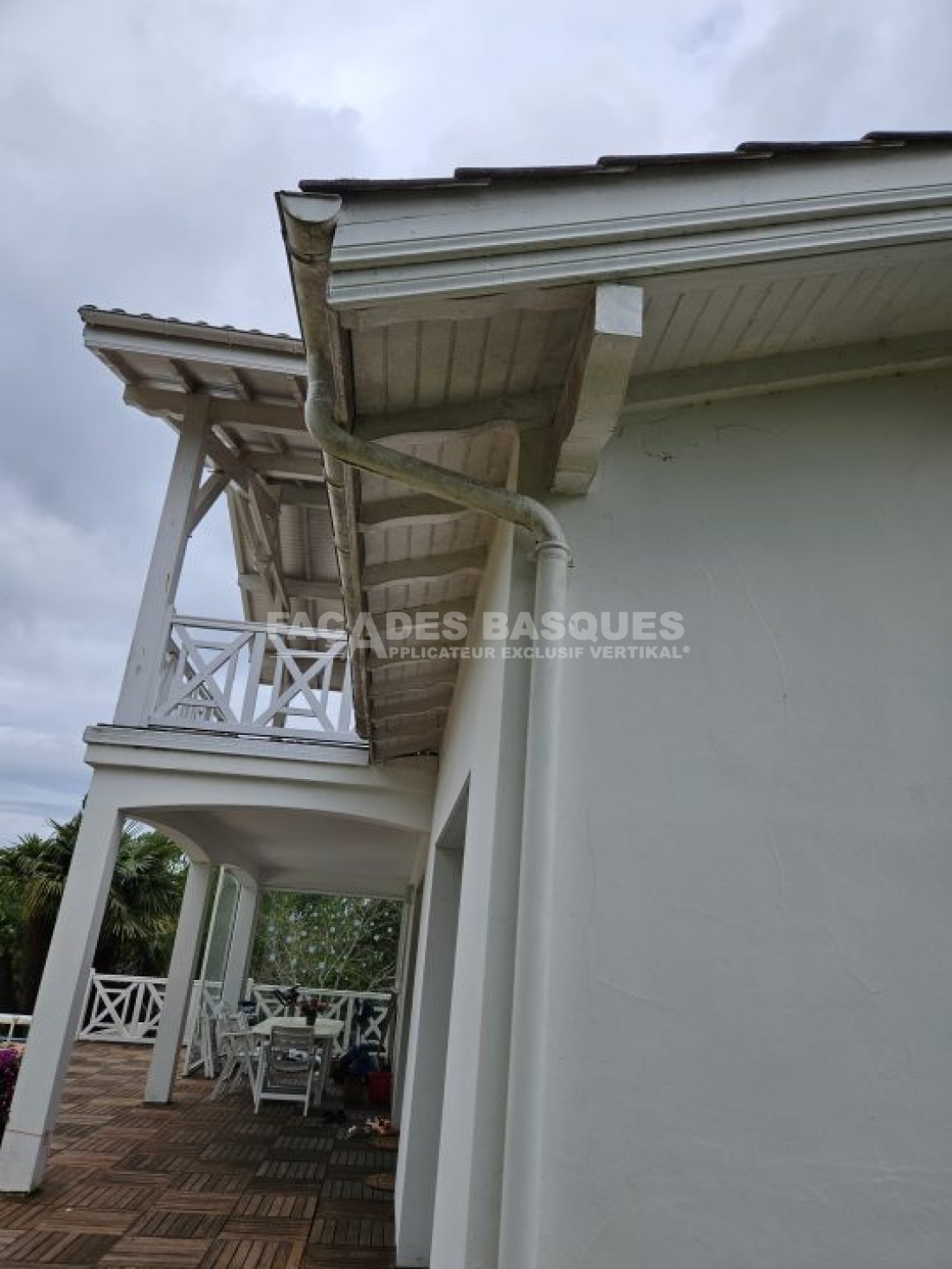 Pourquoi voulait-il refaire la peinture ? les dessous de toit étaient très sales (poussière) et la peinture sur le bois s’écaillait par endroits et sur les murets et contres marches là aussi l’ancienne peinture avait souffert suite aux diverses fluctuations météorologiques, telles que les fortes chaleurs, le froid, les intempéries (pluies, grêles) que connaît le Pays Basque et pas que d’ailleurs.