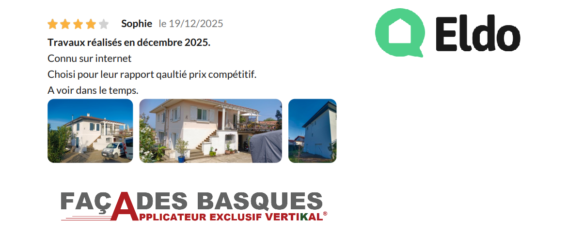 Après des recherches internet, nous avons contacté l'entreprise Façades Basques. Nous avons apprécié sa rapidité de contact. La solution technique et la date d'intervention nous convenant parfaitement, nous avons donc confié nos travaux à cette entreprise. Nous sommes très satisfaits du travail effectué et du résultat final. Nous recommanderons Façades Basques avec plaisir.