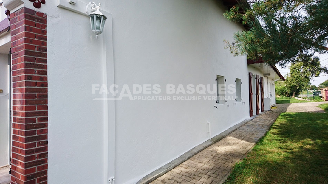 - Mise en œuvre de la finition avec ici le choix du VERTIKAL MINERAL blanc pour les façades. Grâce à sa forte teneur en minéraux, ce revêtement confère au support un aspect mat profond, qui en plus d’être imperméable, microporeux, résistant aux UV, rend tout son chic à cette habitation et pour longtemps puisque le VERTIKAL MINERAL possède une excellente tenue des teintes dans le temps,